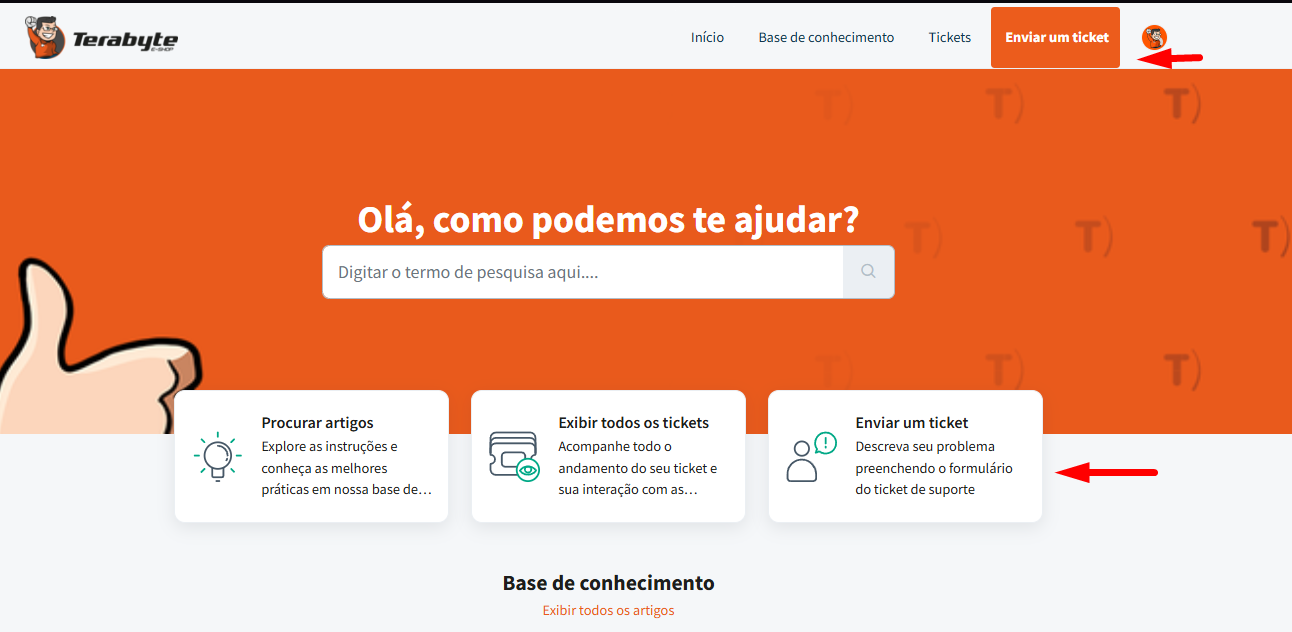 Na tela inicial do portal, clique no botão “Enviar um ticket”.