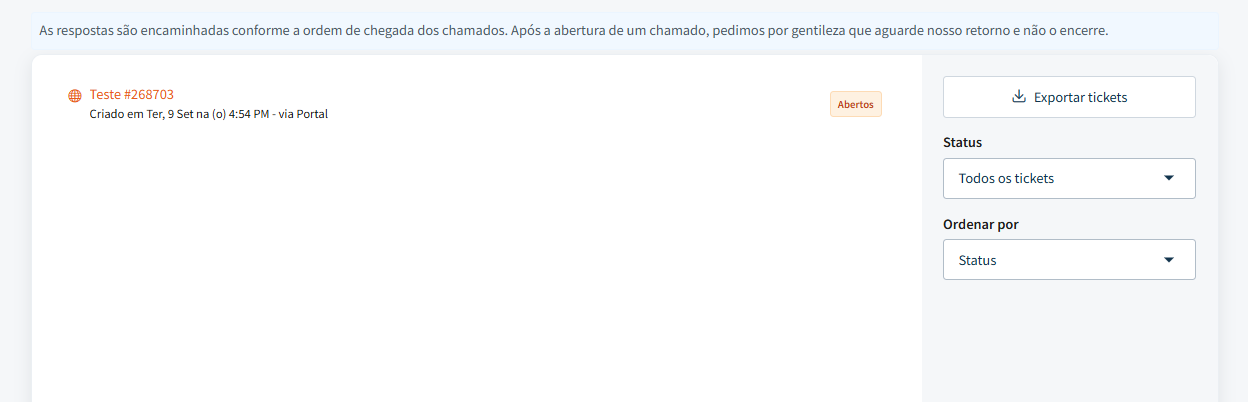 Após o envio, acesse a aba “Tickets” para acompanhar o andamento e responder ao atendimento.